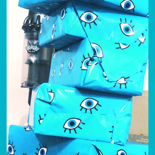 וממש כדי לפנק הוספנו ערימת מתנות ארוזה בנייר עטיפה "עיניים" התואם את הקונספט שכולנו אספנו ביננו ושמרנו את זה לחלק האחרון של הארוחה.